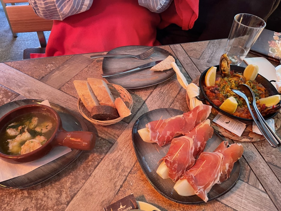 첫 번째는 감바스, 빠에야, 하몽 멜론 이렇게 주문했어요.