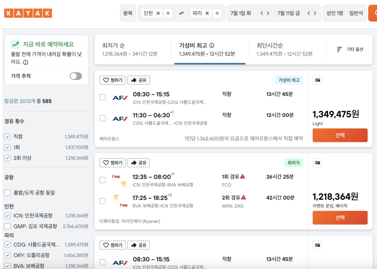 kayak의 장점은 가격 수준이 금액대로 나와서 체감이 잘 돼요!!