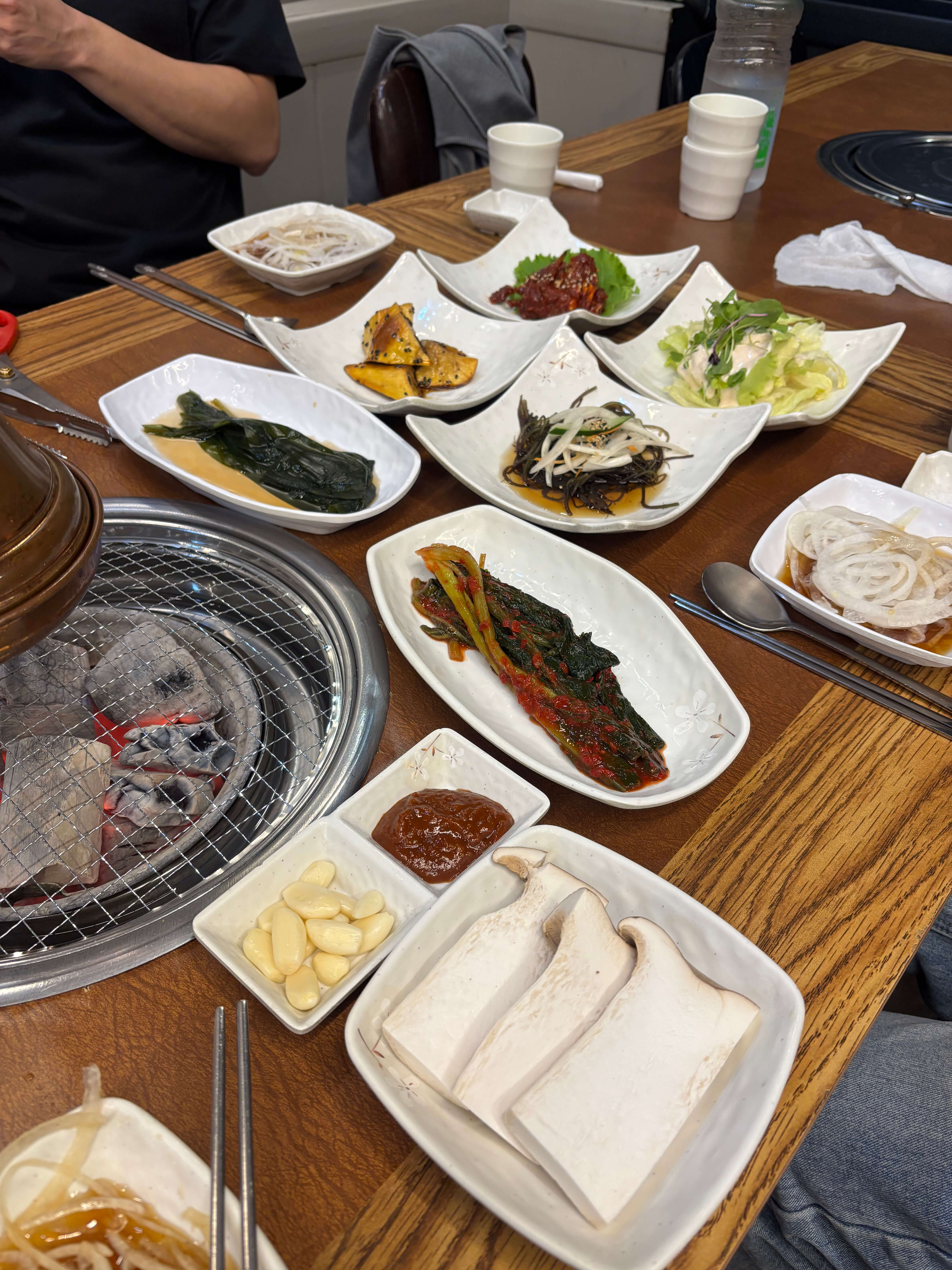 As a butcher-style place, the default banchan set is robust: kimchi, fresh greens, mushrooms,