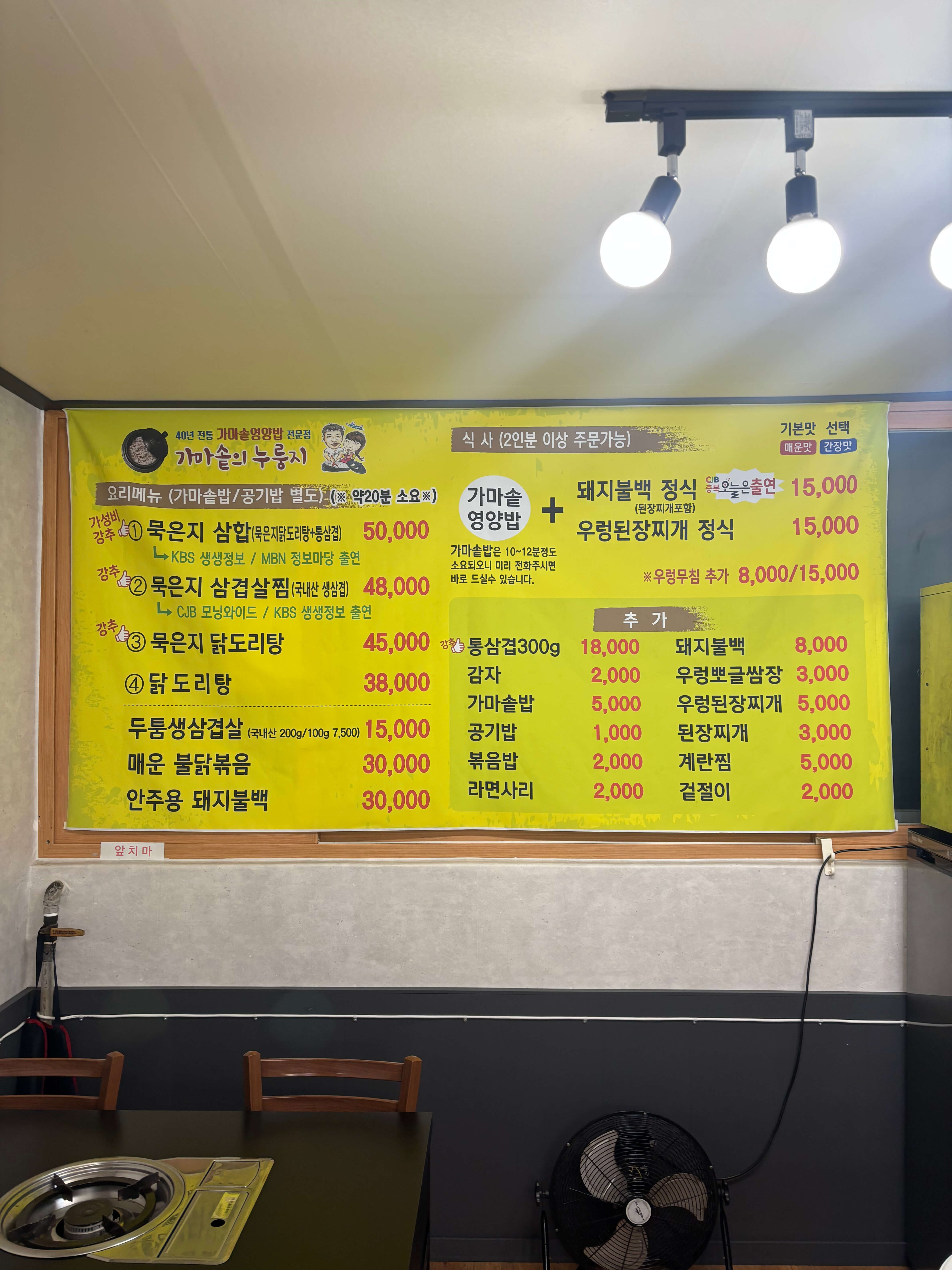 - 돼지불백 정식: 1인 15,000원(개인 가마솥밥 포함, 밑반찬 구성)