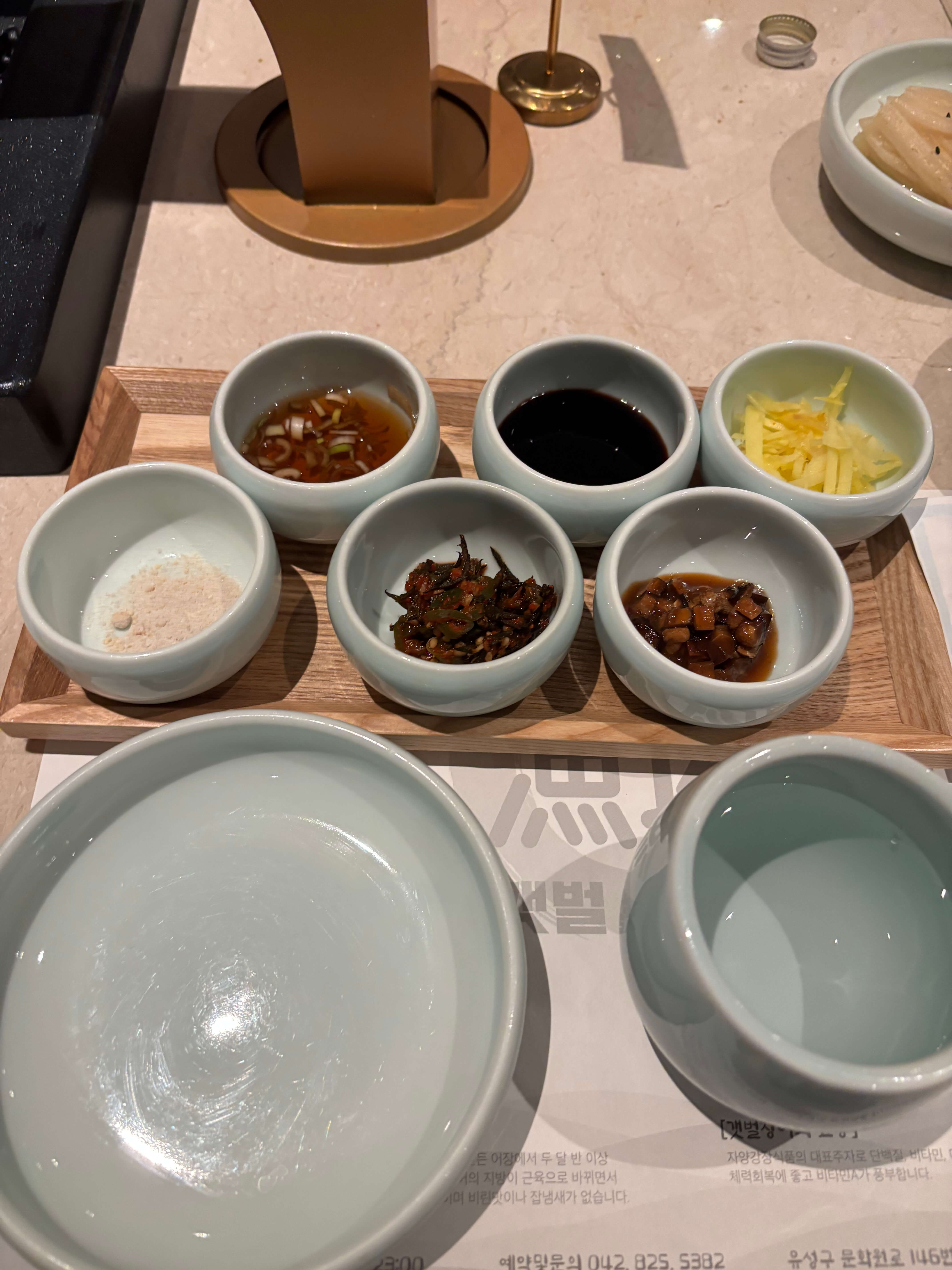 - 장어랑 곁들여 먹기 좋은 생강채, 소금, 간장, 와사비 표고버섯장, 톳·청양초 무침, 복분자 소스 등 양념류들
