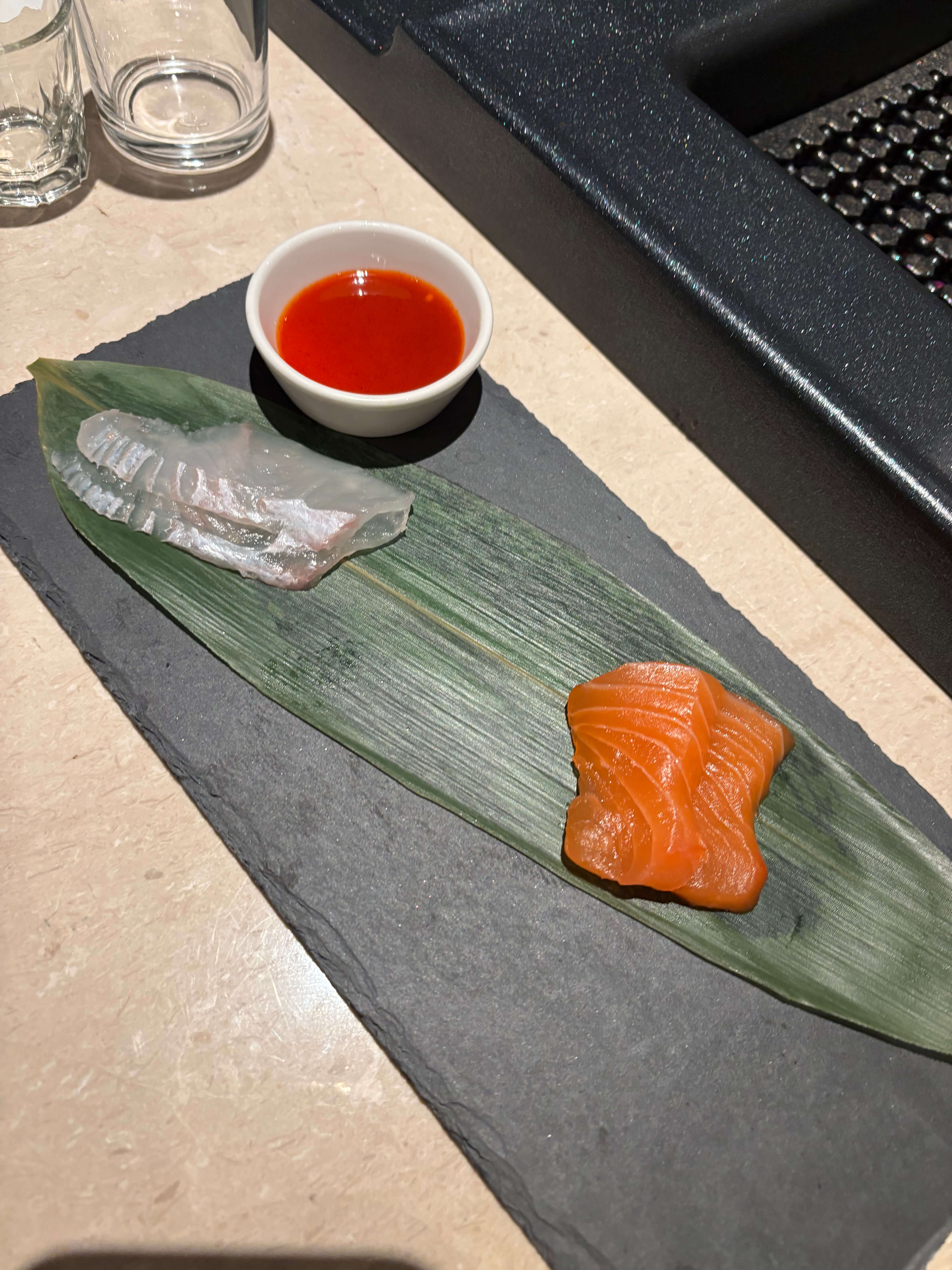 - 광어 + 연어 구성의 작은 회 플레이트
